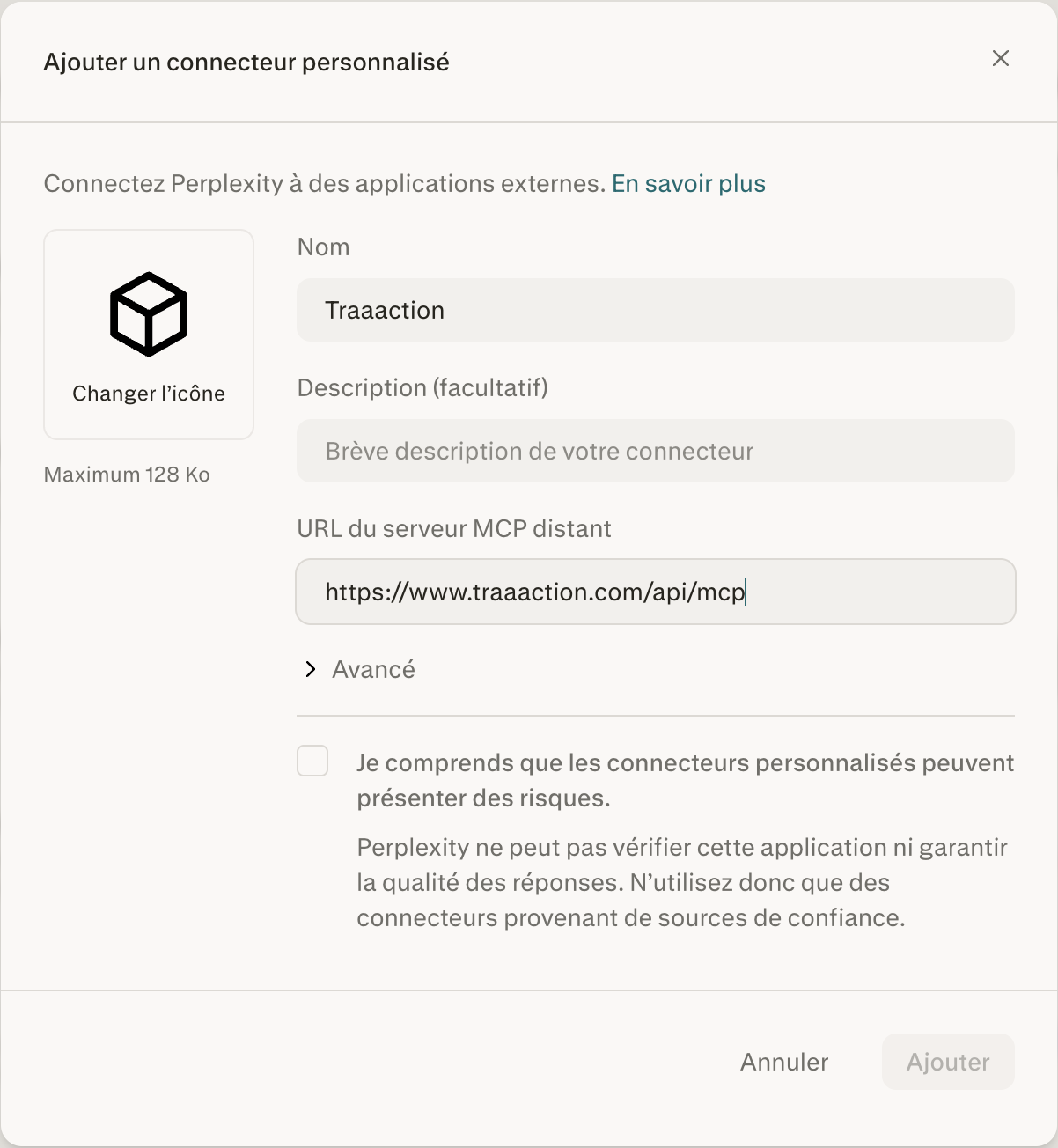 Add custom connector in Perplexity — enter Traaaction as name and the MCP endpoint URL